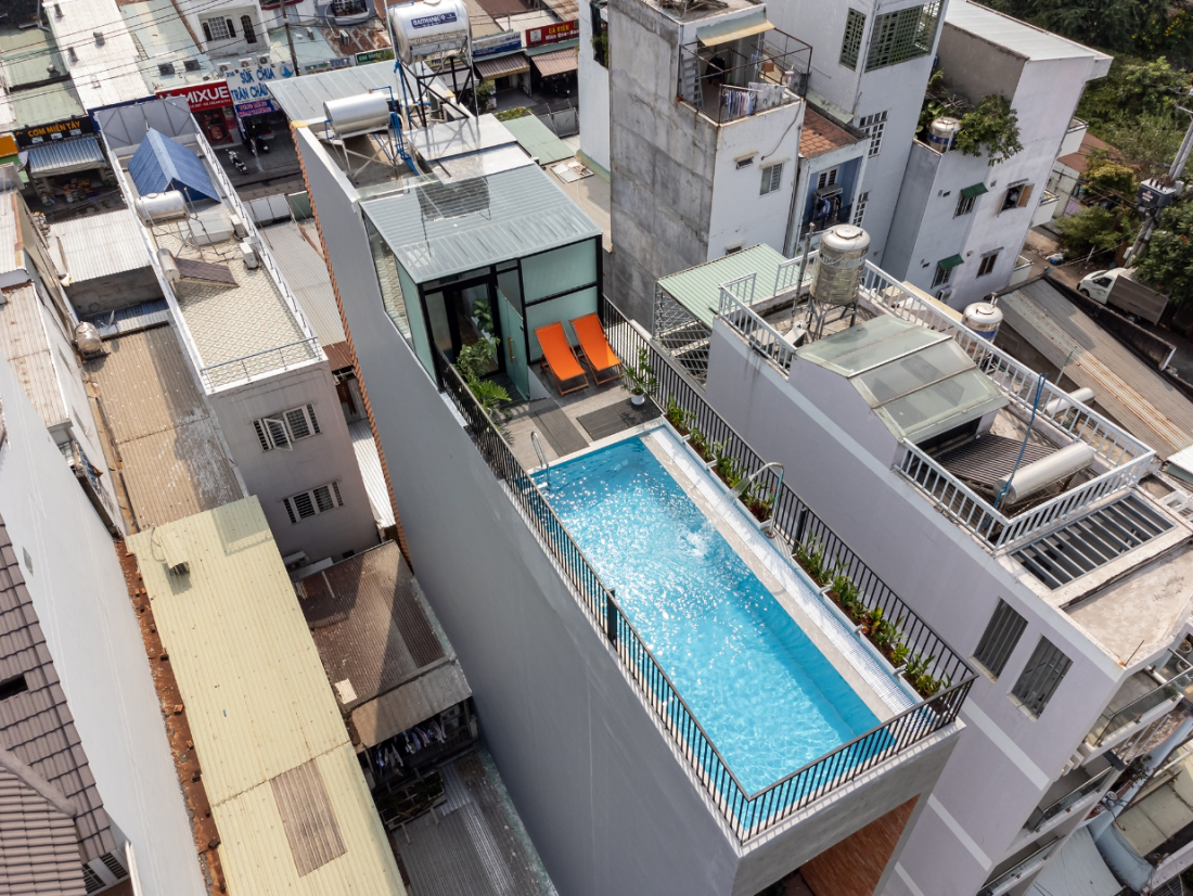 Sân thượng được trang trí một khu vực giặt đồ và hồ bơi với tầm nhìn ra trung tâm thành phố tạo hệ thông gió tự nhiên, kết hợp với tiền sảnh được phủ bằng gạch cổ tái sử dụng từ ngôi nhà cũ nên không bị ảnh hưởng khi trời đổ mưa.