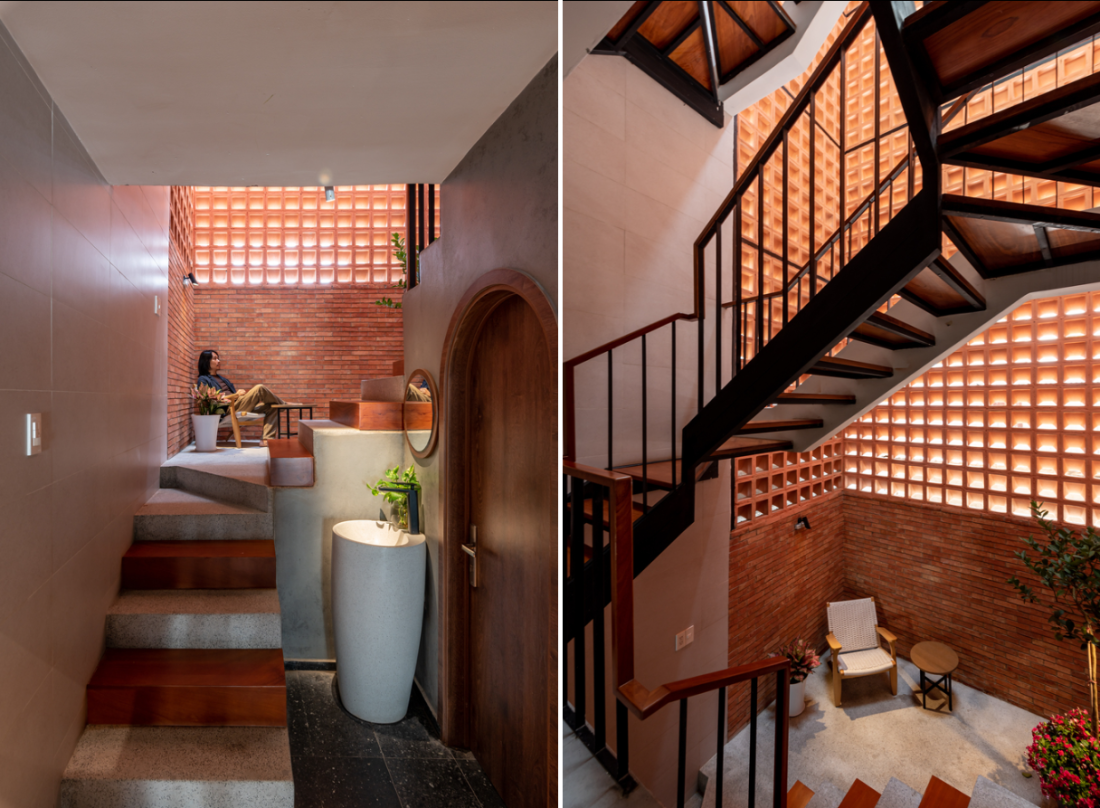 Kiến trúc sư sử dụng những tông màu mang hơi hướng tự nhiên như trắng, vàng gỗ và đỏ của gạch nung, các sắc màu rất dễ phối trong nội thất hiện đại. Ngoài ra, để gây ấn tượng theo thời gian, kiến trúc sư đã kết hợp các bức tường xi măng màu xám và gỗ màu đậm tạo nên sự độc đáo theo cách riêng.