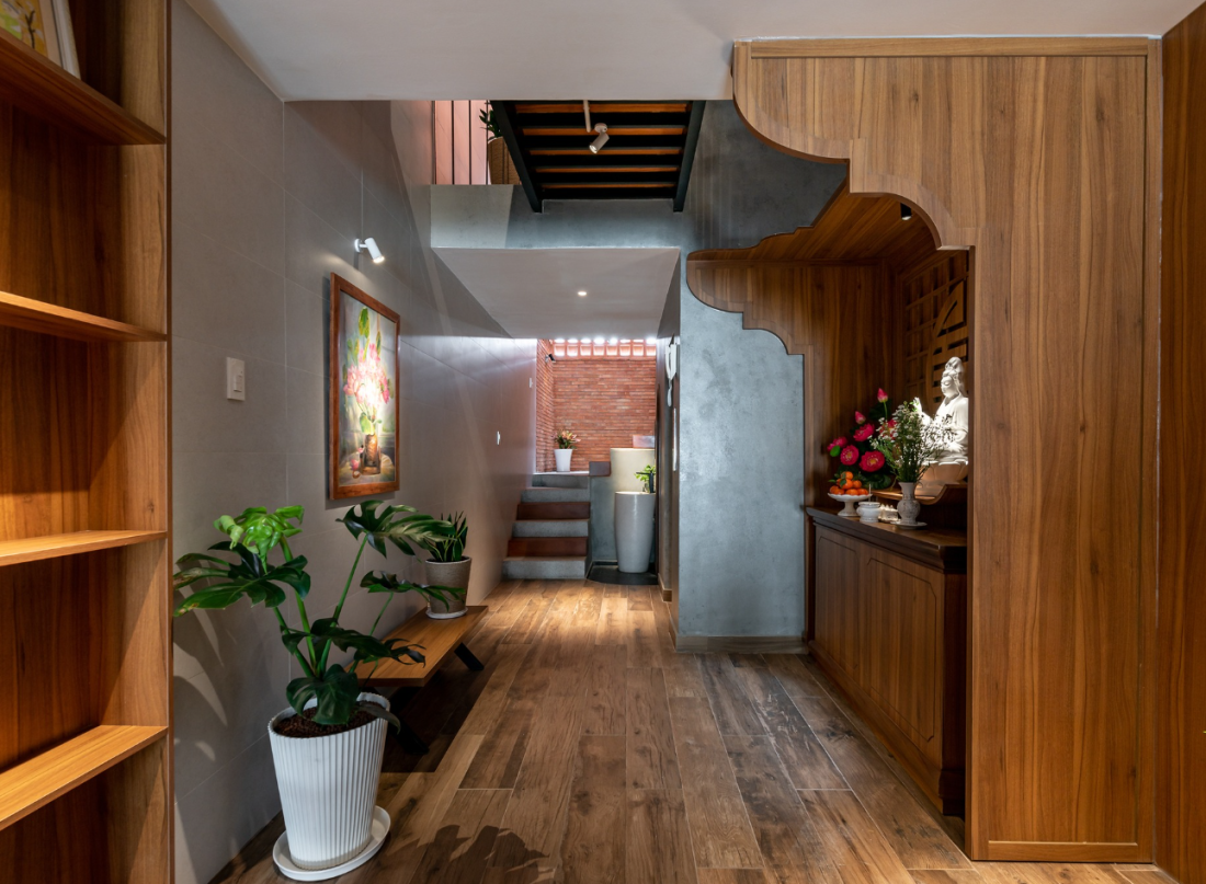 Tầng trệt của ngôi nhà có khoảng sân trước rộng dành cho xe ô tô và xe máy. Đi vào trong là phòng khách kết hợp với phòng thờ. Khu vực thờ bố trí dưới khoảng thông tầng vừa đảm bảo ánh sáng vừa thể hiện sự tôn nghiêm.