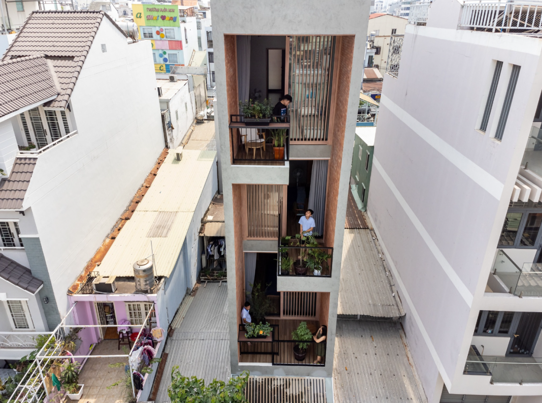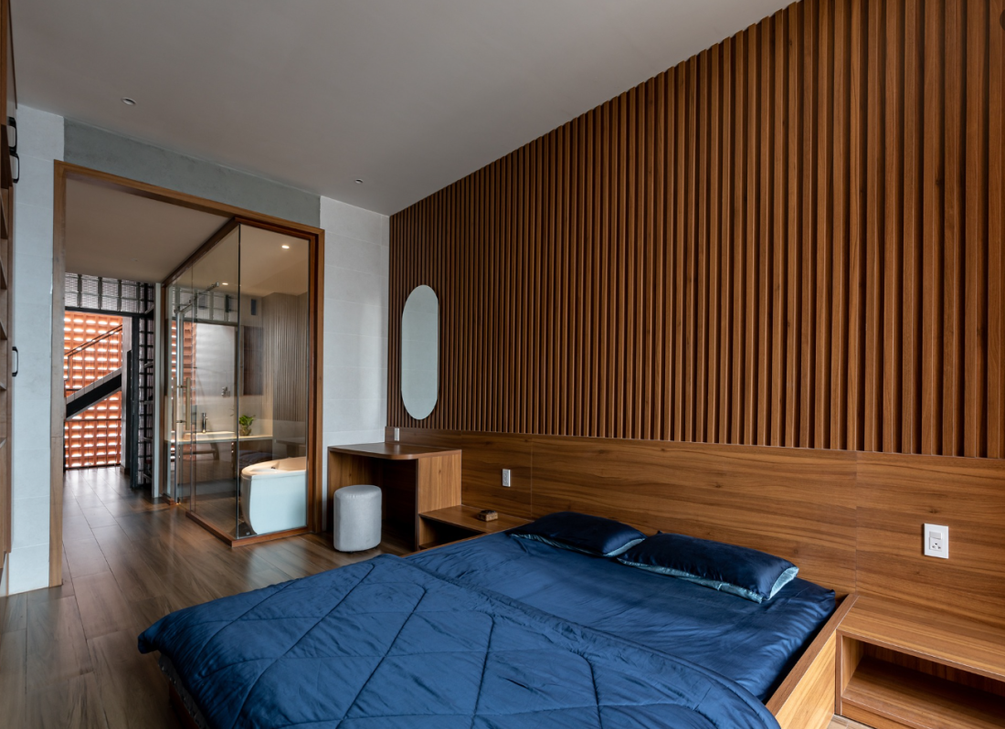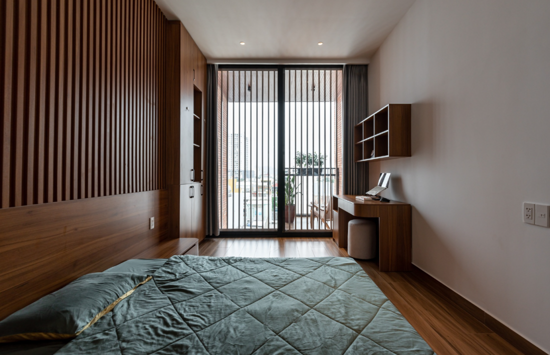 Tường lam gỗ đều lặp lại tại 3 phòng ngủ, mỗi phòng đều có ban công riêng có cây xanh.