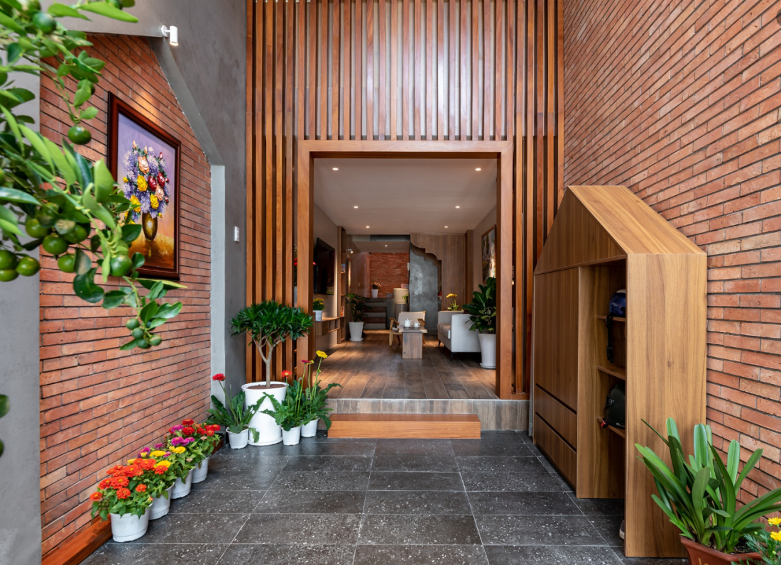 Vách dựng lam gỗ gây ấn tượng ngay lối vào nhà tại tầng trệt.
