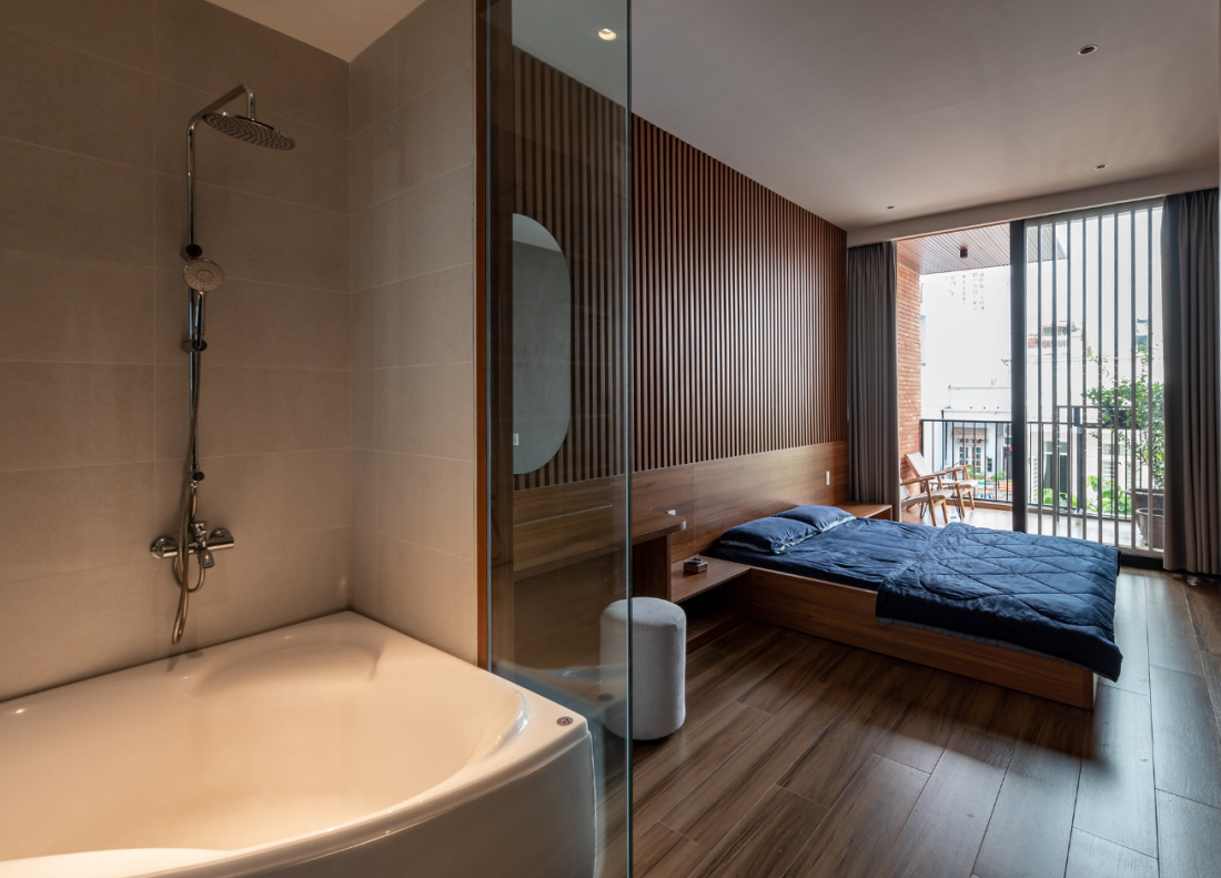 Tầng 2, 3 và 4 mỗi tầng có phòng ngủ với phòng tắm riêng, phòng tắm được thiết kế bao quanh tường kính giúp tăng khả năng đưa sáng và tăng diện tích cho không gian.