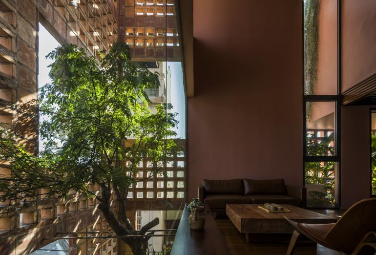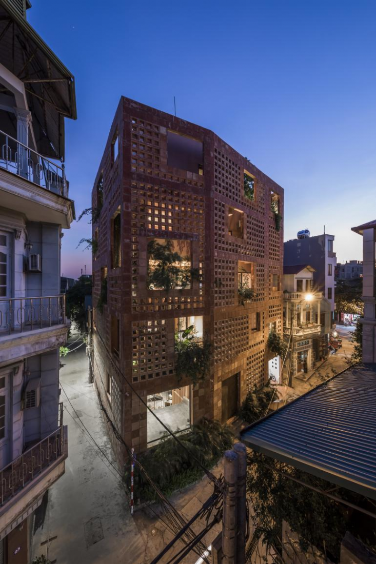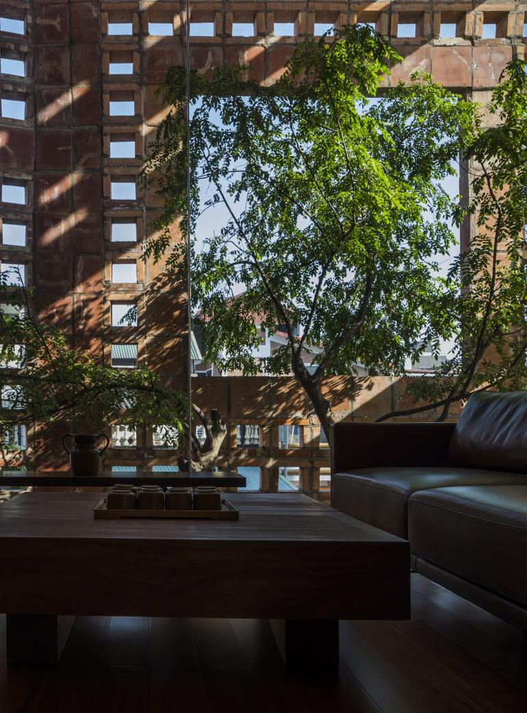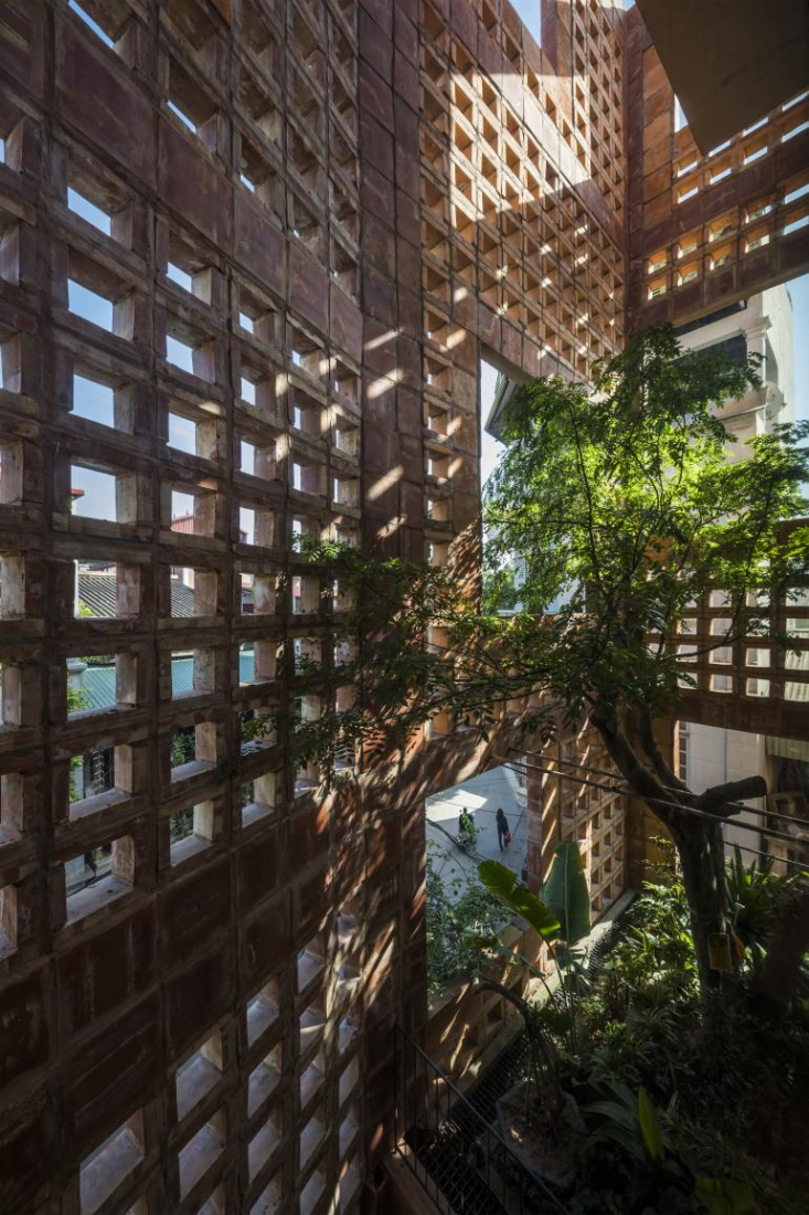 Các bức tưởng như tấm áo choàng gốm này bảo vệ ngôi nhà khỏi ánh nắng mặt trời mùa hè và gió lạnh mùa đông, trong khi các lỗ trống đảm bảo ngôi nhà nhận được nhiều ánh sáng tự nhiên. Những khoảng trống lớn tạo điều kiện cho cây cối và thực vật ở các khu vườn trên cao tràn qua mặt tiền màu đất nung.