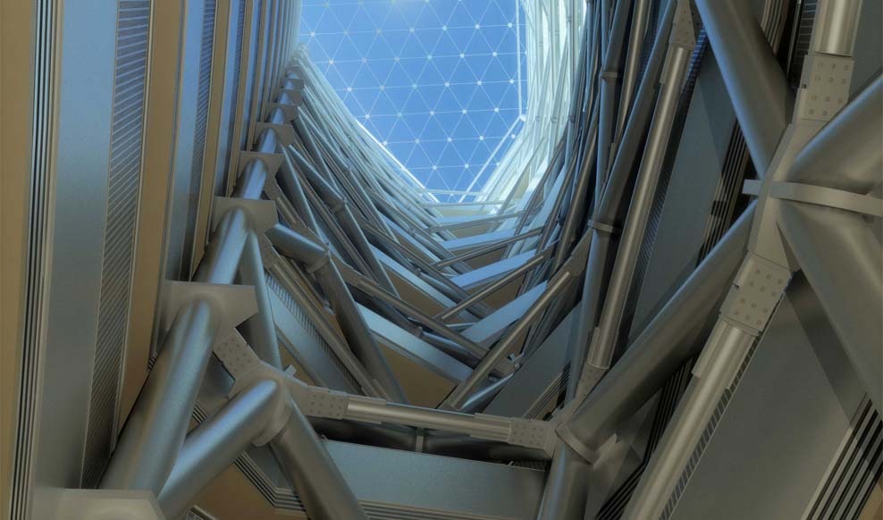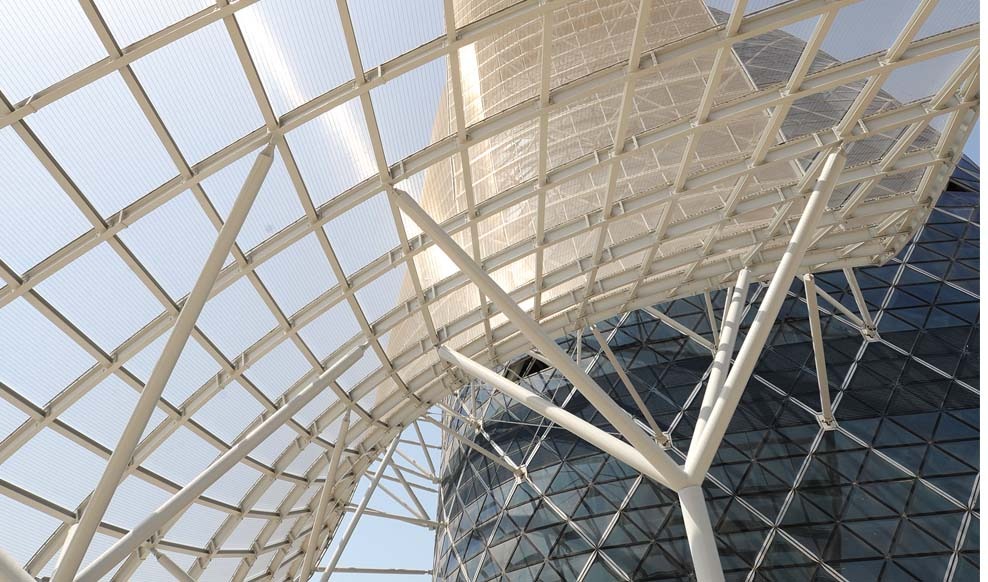 Thân công trình gồm một khối khung thép pha hợp kim bền vững, chịu được thời tiết khắc nghiệt chống ăn mòn, có nhiều thanh kim loại nhỏ đan lồng vào nhau với mục đích trang trí kèm khả năng hỗ trợ chịu lực. Bên ngoài khung sườn được lắp hệ thống kính màu cường lực khép kín từ cả nghìn ô kính khác nhau.