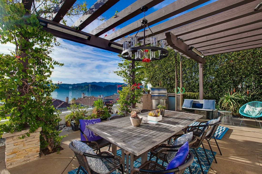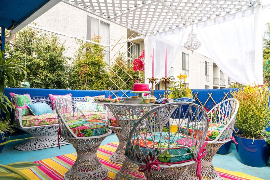 Những mảng màu rực rỡ giúp nâng cao sự sang chảnh cho sân trong mang phong cách nhiệt đới này.