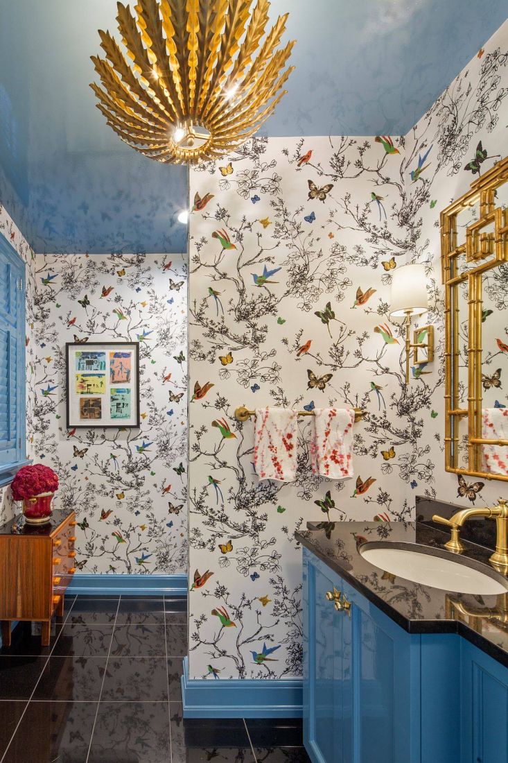 Phòng tắm đầy sức sống và tràn đầy năng lượng với giấy dán tường, sàn gỗ và mặt bàn đá cẩm thạch.