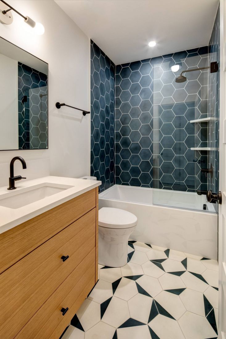 Gạch lát nền đẹp mang lại hình mẫu cho phòng tắm hiện đại này.