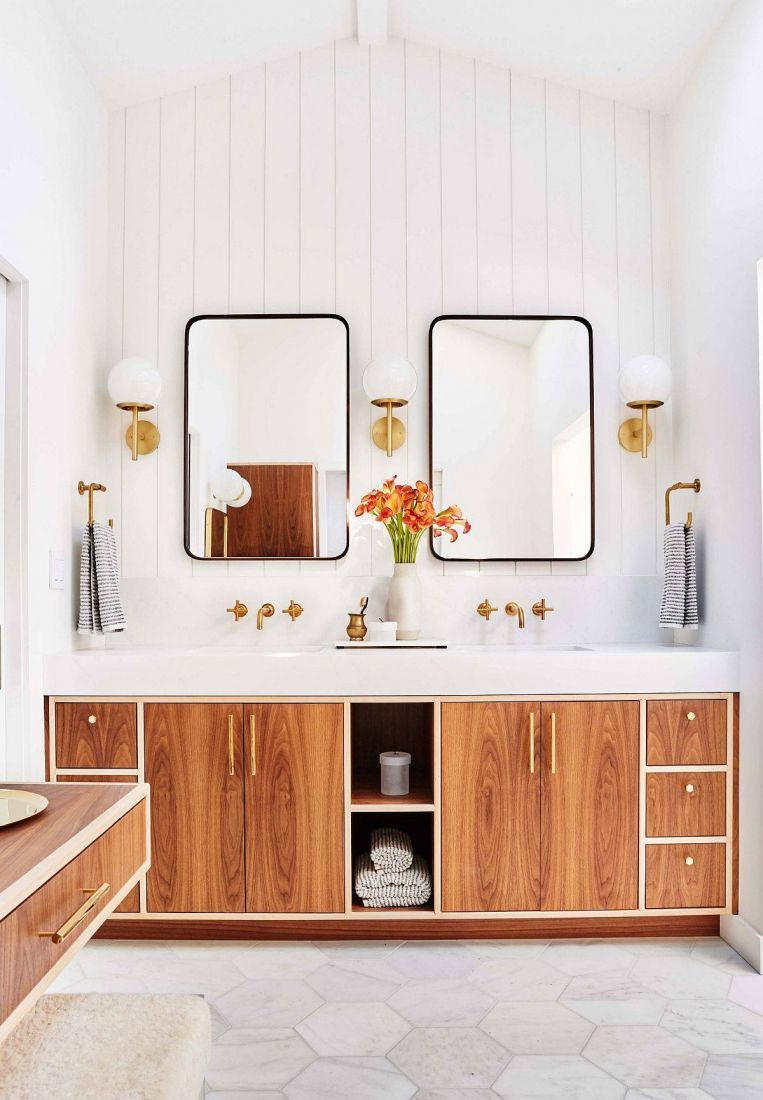 Trong các phòng tắm mộc mạc, trang trại, truyền thống và phòng tắm công nghiệp, việc kết hợp các yếu tố bằng gỗ là điều quá dễ dàng. Nhưng trong các phòng tắm hiện đại, đương đại, tối giản và Scandinavia hãy sử dụng bàn trang điểm nổi bằng gỗ để tạo hiệu ứng hoặc những bức tường nổi bật bằng gỗ tái tạo, sàn và trần nhà bằng gỗ... cũng là những lựa chọn tuyệt vời cho mùa thu năm 2021.
