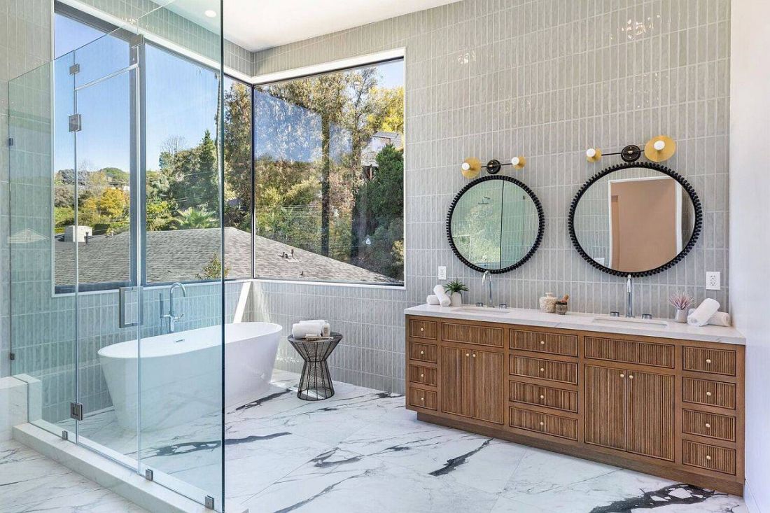 Sàn đá cẩm thạch dễ dàng gây sự chú ý lớn cho phòng tắm hiện đại này.