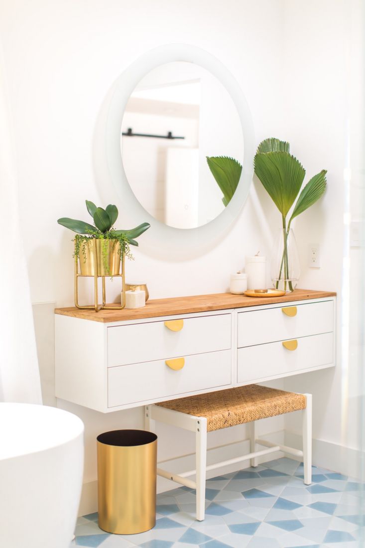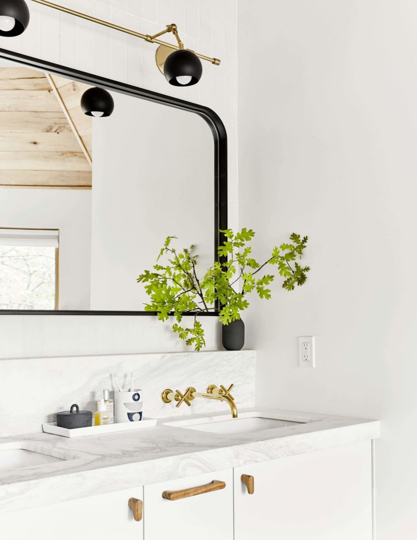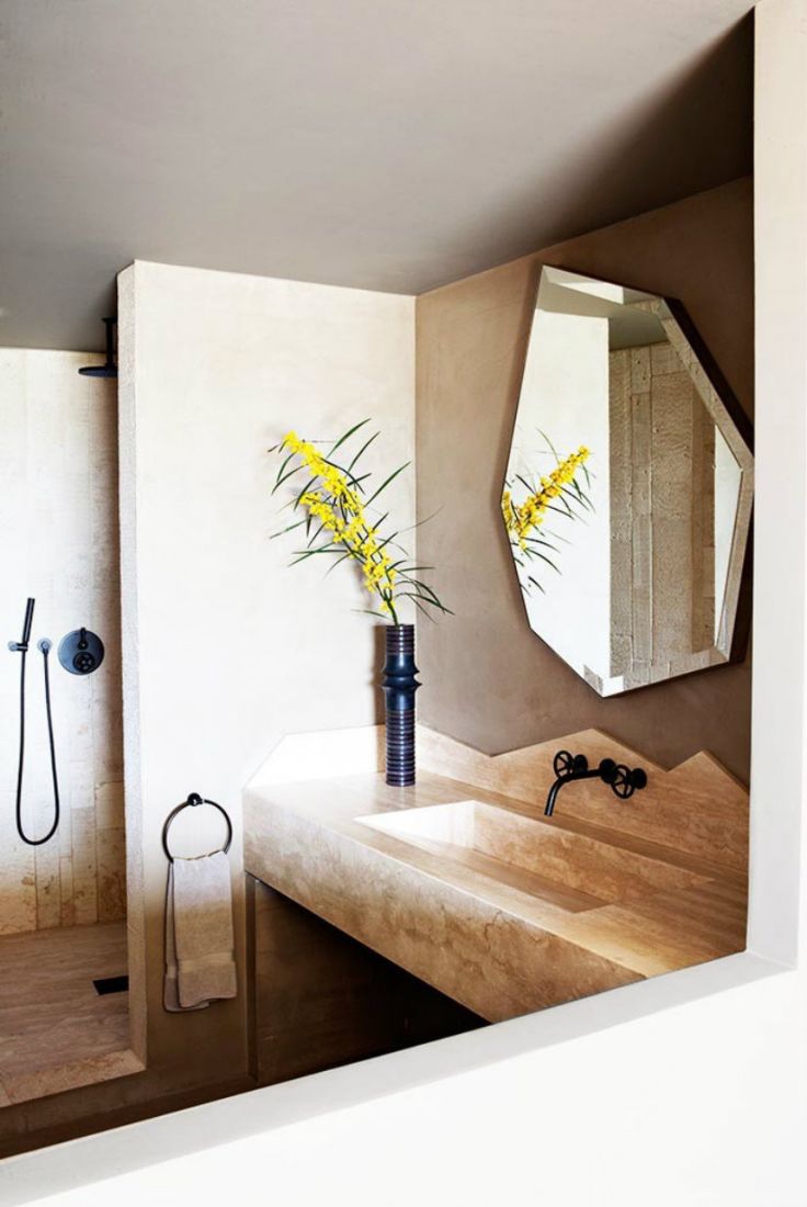 Gương hình lục giác này sẽ thành tâm điểm của phòng tắm đẹp mắt này.