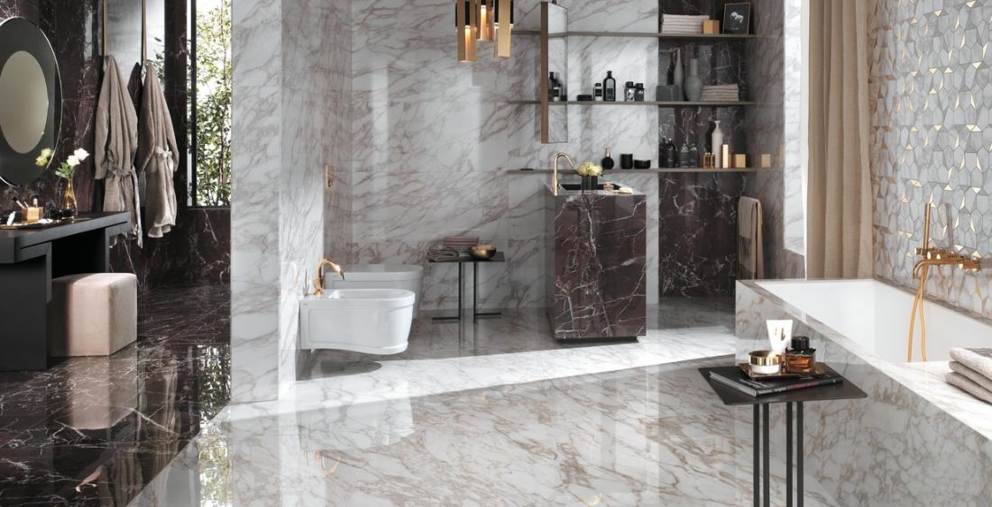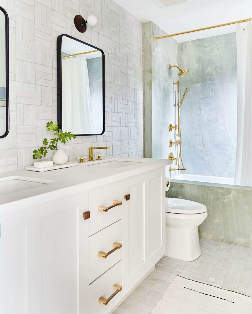 Phòng tắm sang trọng này là sự kết hợp khá hài hòa của nhiều loại hoa văn đá cẩm thạch, các gam màu trung tính và đặc biệt có sự xuất hiện của chiếc gương tròn viền đen.