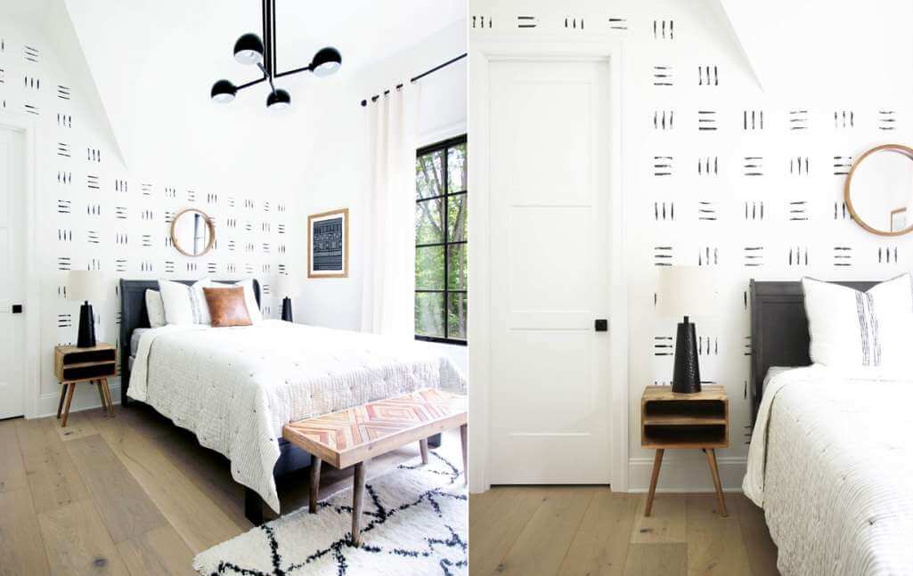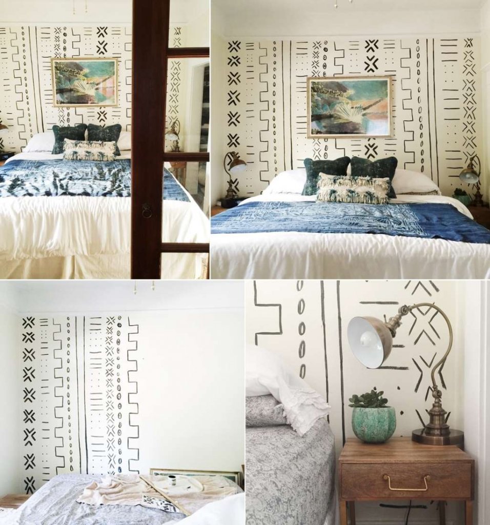Để giảm bớt sự nhàm chán cho những bức tường trắng, bạn có thể tạo bản in Aztec bằng sơn đen bằng cọ mỏng, tạo những họa tiết thú vị phía đầu giường.