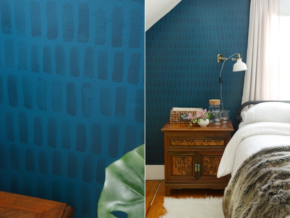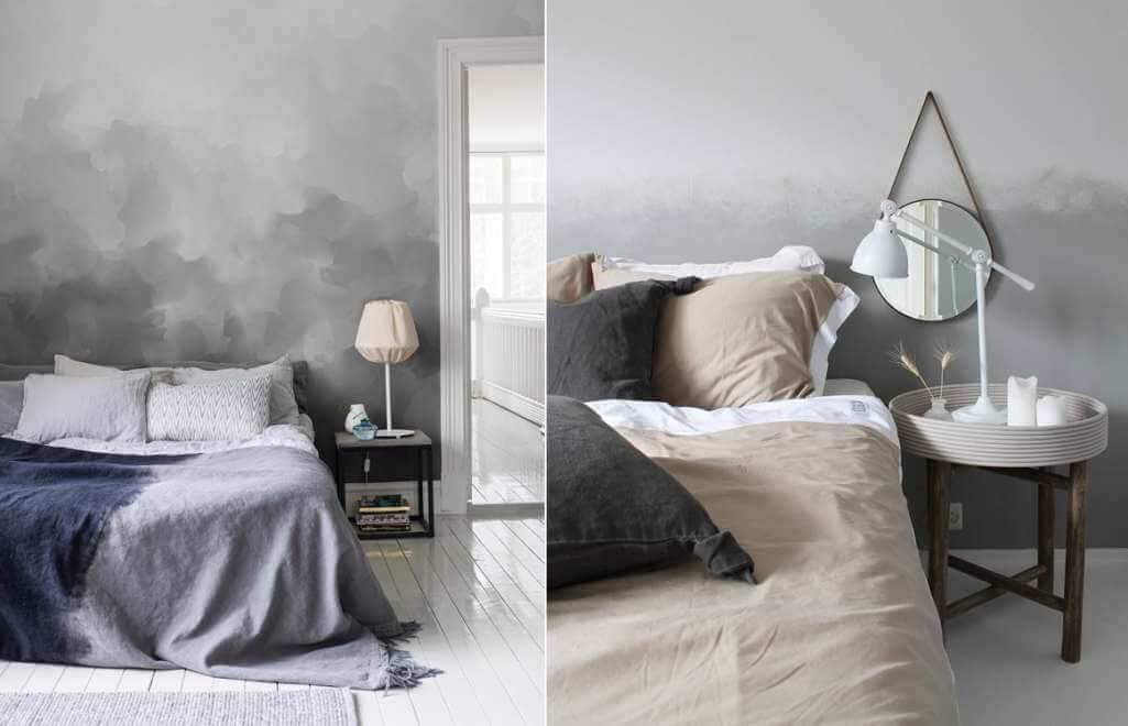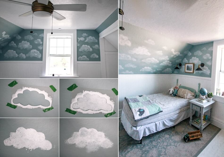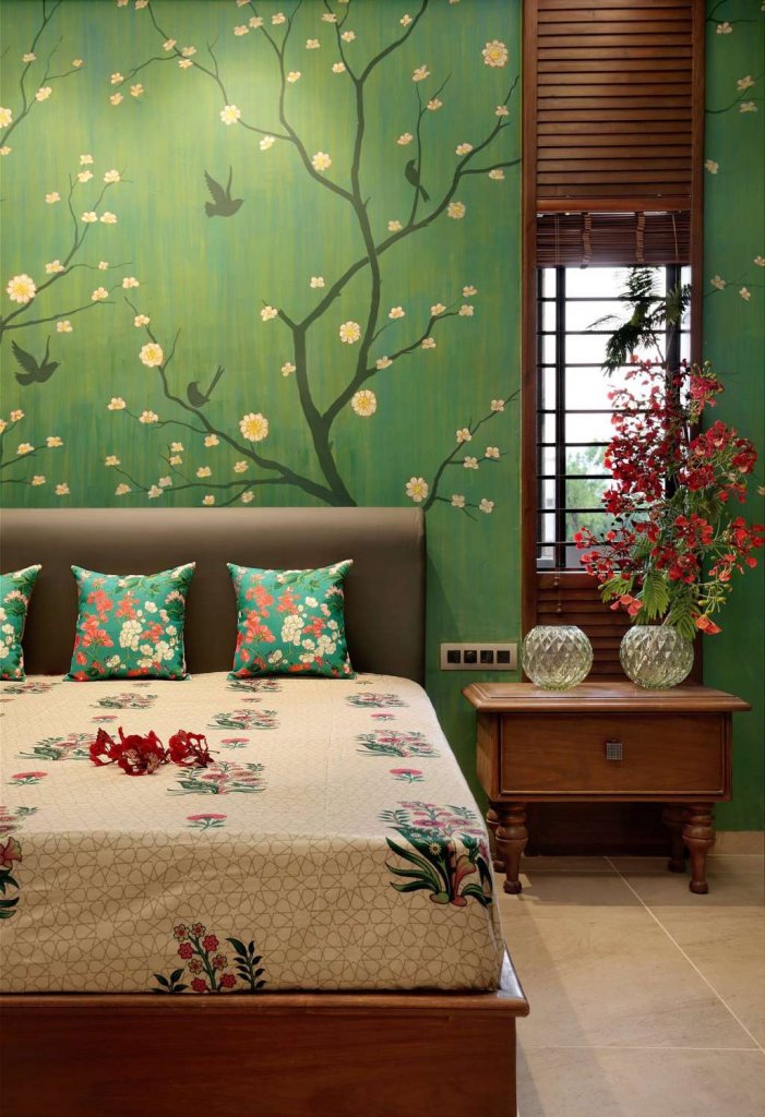 Nếu yêu thích sắc xanh, bạn hãy thử sơn bức tường phòng ngủ với hai sắc thái xanh và sau đó thêm các họa tiết cây, hoa và bóng chim trang trí.