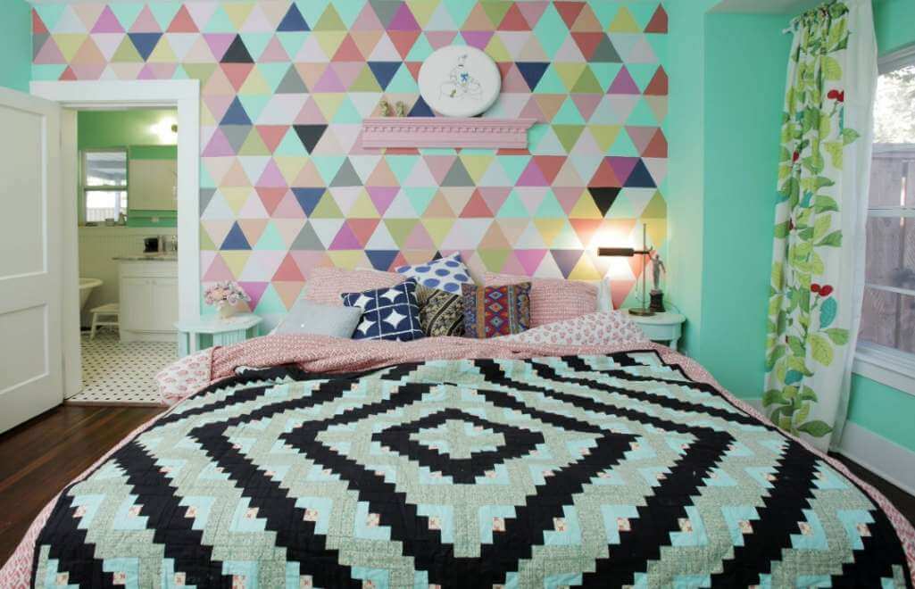 Chọn một bảng màu và sau đó áp dụng nó để tạo một bức tường hoa văn tam giác, đồng điệu với nội thất trong phòng ngủ.