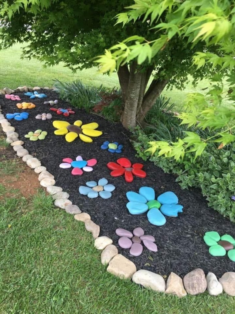Bạn có thể lấy những viên sỏi, dùng sơn acrylic tô màu cho nó và đặt thành hình những bông hoa đầy màu sắc tươi mới, tạo điểm nhấn cho khu vườn.