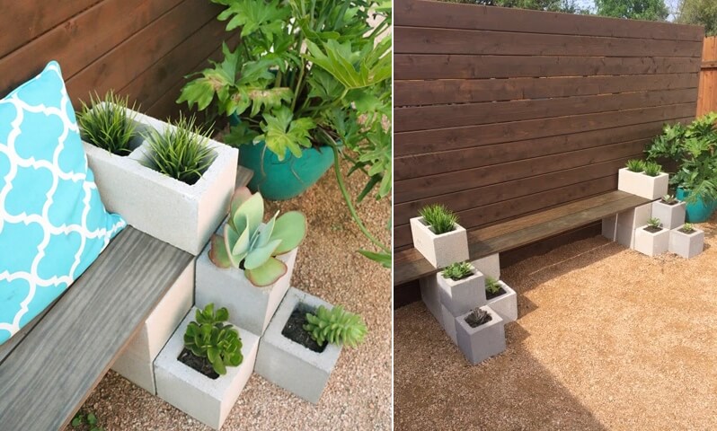 Tạo một không gian thư giãn, tắm nắng trong góc vườn với băng ghế dài, trang trí thêm những chậu cây xanh được làm bằng xi măng.
