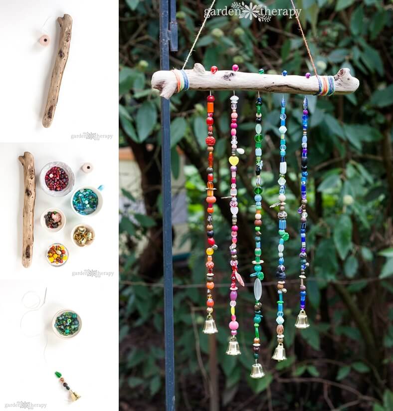 Bạn cũng có thể tạo chuông gió đầy màu sắc trang trí không gian ngoài vườn bằng hạt nhựa, dây và thanh gỗ lũa.
