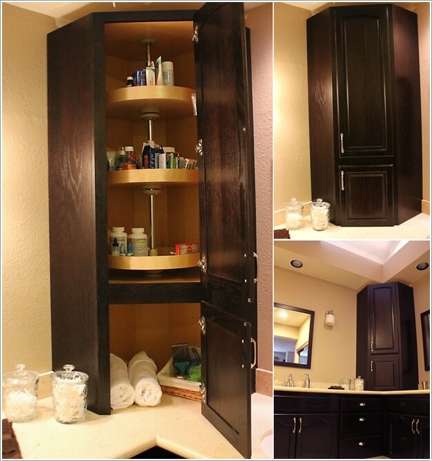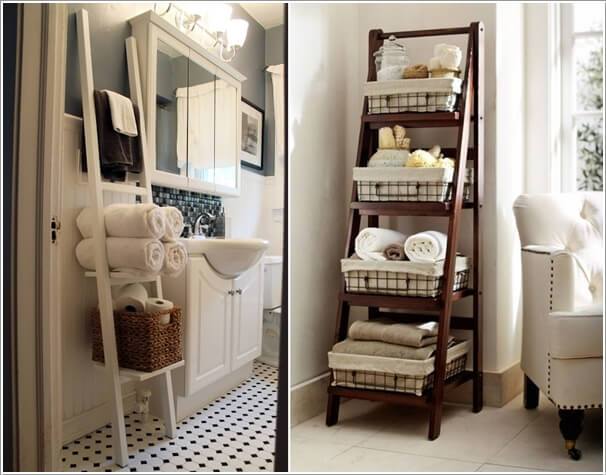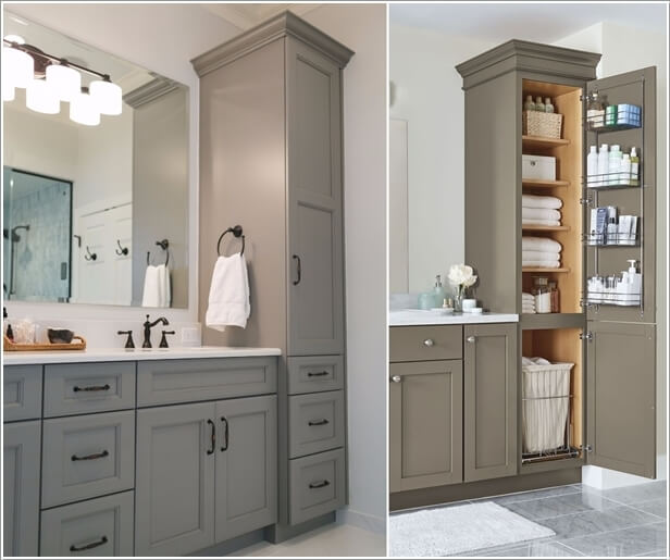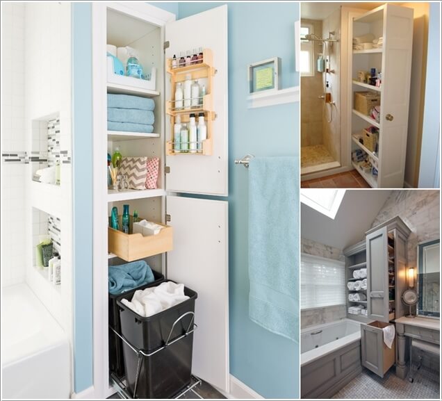 Mở rộng không gian lưu trữ bằng tủ nhỏ dọc tường trong phòng tắm. Bạn cũng có thể tận dụng không gian nơi cánh cửa để chứa đồ.