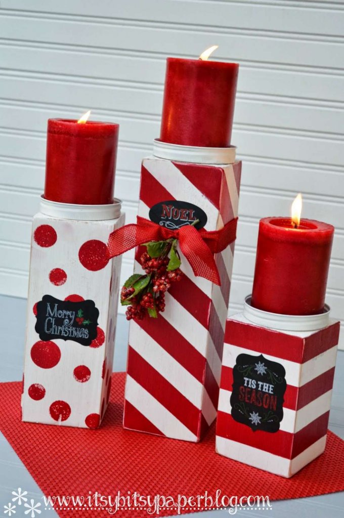 Làm đế nến từ những thanh gỗ và sơn chúng màu đỏ và trắng nổi bật.