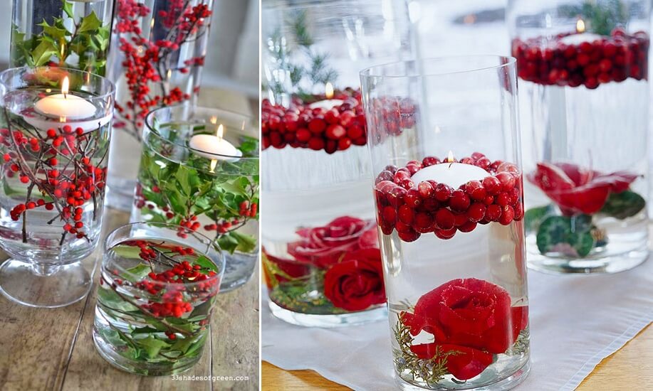 Đặt hoa hồng và quả mọng giả trong lọ dài và thêm nến nổi sau khi đổ đầy nước trang trí trên bàn tiệc.